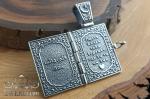 На фото изображена массивная раскладная подвеска со львом и полумесяцем со звездой из серебра 925 пробы с чернением выполнена в форме миниатюрной книги-складня, сочетающей символику силы, веры и защиты. Конструкция на шарнире открывается, раскрывая декоративно оформленные внутренние панели с рельефными надписями и орнаментами.