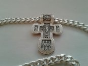 Изображено на кресте: Распятие Христово. Святая Троица. Святой Николай Чудотворец. Мученик Трифон. Три святителя. Икона Божией Матери "Толгская". Ангел Хранитель. Преподобный Сергий Радонежский. Святой Спиридон Тримифунский.1. Размер: 7 х 4 мм